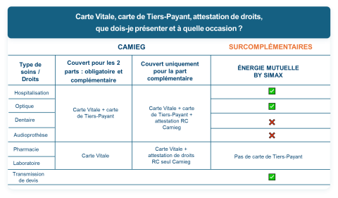 - Une carte unique où vous serez dispensés d'avancer les frais aussi bien pour vos garanties CAMIEG (régime complémentaire) que pour celles de votre couverture supplémentaire Energie Mutuelle.
